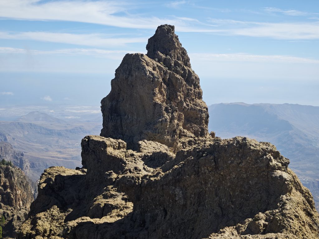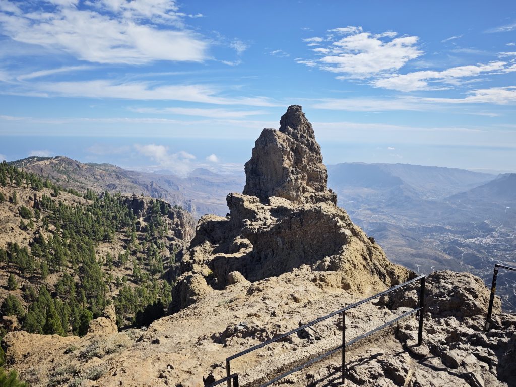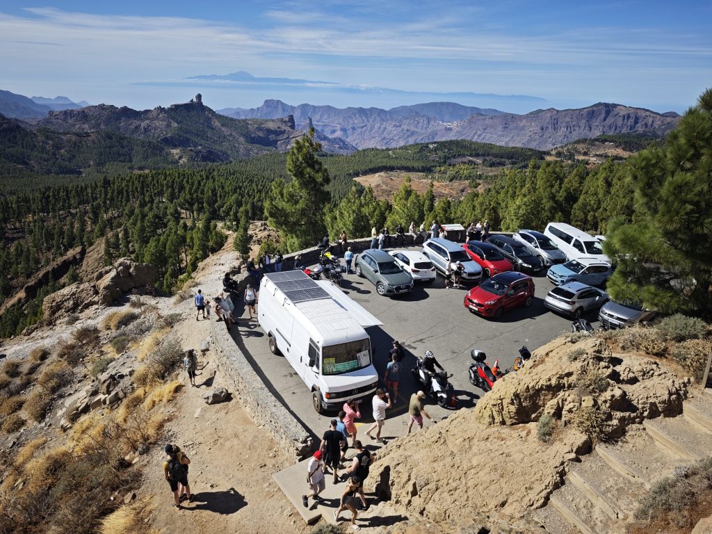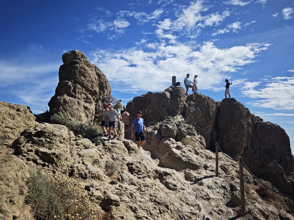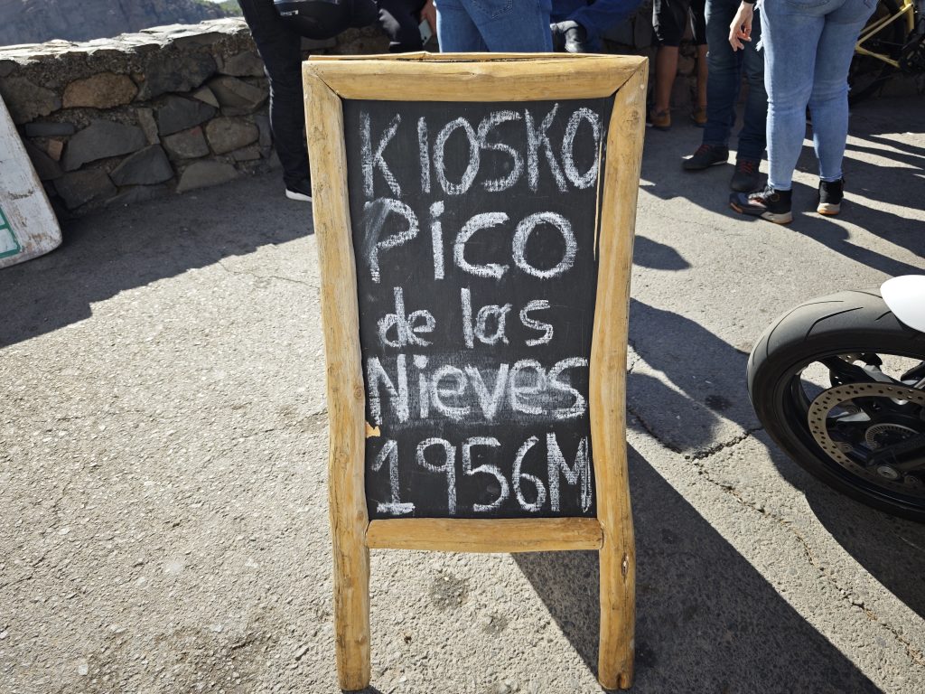 Nejvyšším bodem ostrova je skalisko Morrón de la Agujereada s výškou 1 956 m n. m., ale pro zdolání je. třeba mít sebou lano a nebo být Adam Ondra. S námi byl jen Adam A. a Ondra H., což na výšplh na skalisko nestačí. Ve většině zdrojů je uváděn jako nejvyšší kopec Gran Canarie vrchol Pico de las Nieves (v překladu Sněžná hora), který se nachází cca 120m od skaliska MdlA. Kopec Pico de las Nieves zdolá každý, který se umí vyhrabat z parkoviště přes přibližně třicet schodů. Kdo to neumí, zůstane na parkovišti a vyplení pojízdnou prodejnu nápojů a pochutin. My jsme velcí sportovci a tak celá šestice dosáhla vrcholu, na ostrov jsme se dívali z nadmořské výšky 1949. Vrcholový betonový patník si bez lidí jen tak nevyfotíte, neboť na tento typ kopce se dostane kdejaký materiál a mnohým nedochází, že by mohli posedět o pár metrů vedle (zlaté Fuji). Vrcholové pivo jsme zvládli vypít jíž na pobřežní neb platí známé kanárské pořekadlo „lepší studené pivo na pláži, než teplé pivo na Pico de las Nieves“.