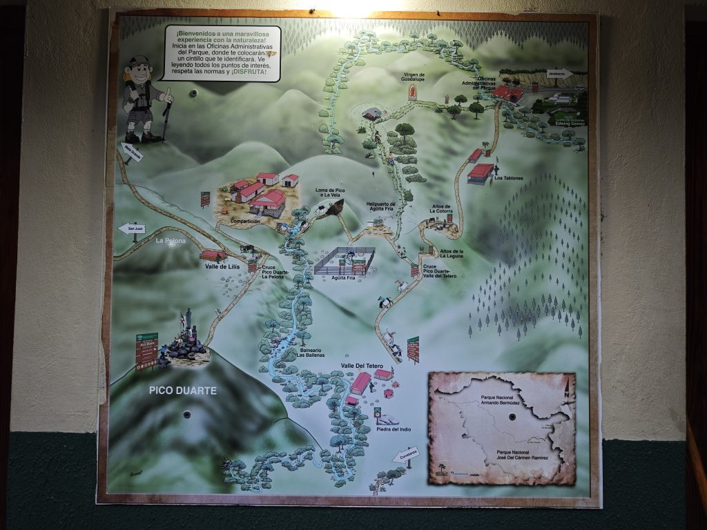 Po snídani mne čekala velká porce kilometrů do hor a po téměř pěti hodinách jsem se ubytoval v apartmánu na konci světa, v krásném domečku s apartmánem Apartamento Los 3B pro turisty za necelých 1000kč/noc. Majitel David, který mi na dálku pomohl zajistit průvodce se ukázal jako dokonalý pronajímatel přes AirBnB a zajistil mi komfort před a po výstupu. V sedm hodin ráno se mi podařilo po cca 20 minutách dorazit ke vstupu do národního parku v obci La Ciénaga de Manabao a zde mne již čekala káva a průvodce. Rychle jsme zkontrolovali, zda mám opravdu vše potřebné pro přežití pod vrcholem a byli jsme předáni jezdci na mule, který se stal průvodcem pro další dva dny. Zajisté uměl velmi dobře španělsky, internetový překladač nefungoval a tak jsme si poradili bez zbytečných slov. První den jsme se vyhrabali do kempu La Compartición, našlapali 17km, nastoupali 1725m a sestoupali 384m. Kemp se nachází ve výšce 2460 m n.m., stan se podařilo postavit během pár minut a mohli jsme se kochat přípravou večeře. Ve velké kuchyni se nachází mnoho menších ohnišť na stole a na nich vaří každý průvodce své jídlo. Na vrchol jsme vyrazili bez snídaně ve 4:00, za svitu čelovek na nás mrkala jinovatka a necelých 5km uteklo jak nic. Společně s dalšími turisty jsme si zažili východ slunce na vrcholu Pico Duarte, ve výšce 3101 metrů nad mořem. Po sestupu do tábora jsme měli v nohách již skoro 10km, dostali jsme na snídani vejce s banány a lokální kafe. Sbalili jsme stan, následovalo krutých 17km a zpětně uznávám, že pokud tam turistu překvapí déšť, tak rozhodně nemá o pády nouzi. Druhý den expedice jsme dali 26km, nastoupali u toho 633m výškových metrů a sestoupili ukrutných 2360 výškových metrů. Celkově jsme ušli 43km za 33hodin, dole se rozloučili s průvodcem a darovali mu stan, který bych na dalších výstupech pravděpodobně nevyužil (a také jsem potřeboval v kufru místo na rum). Nejvyšší hora Karibiku nám dala šanci.