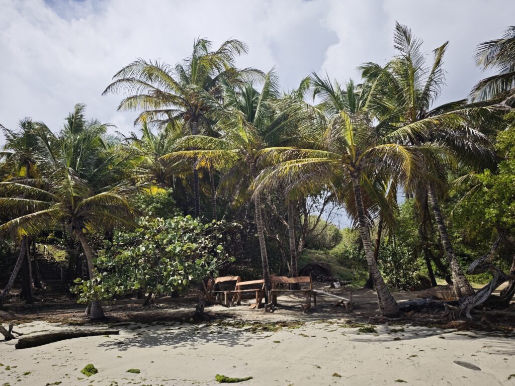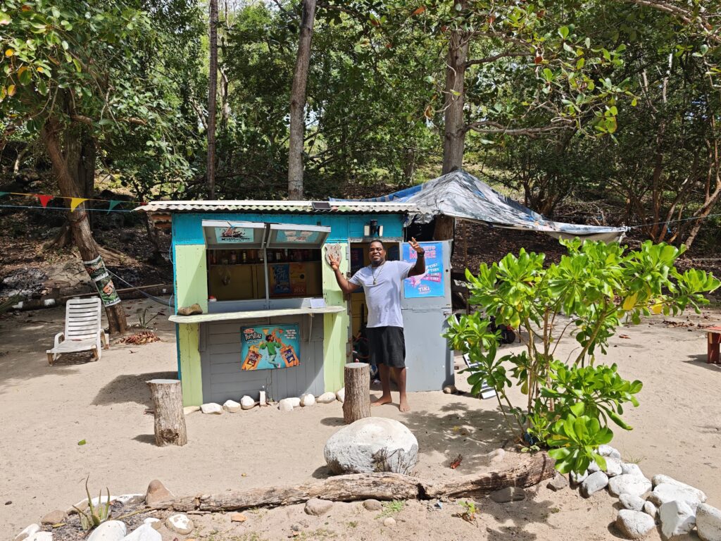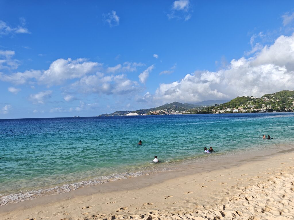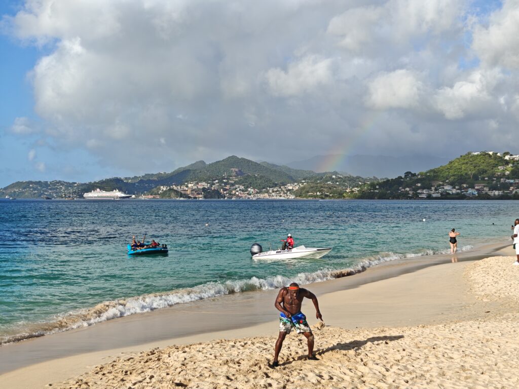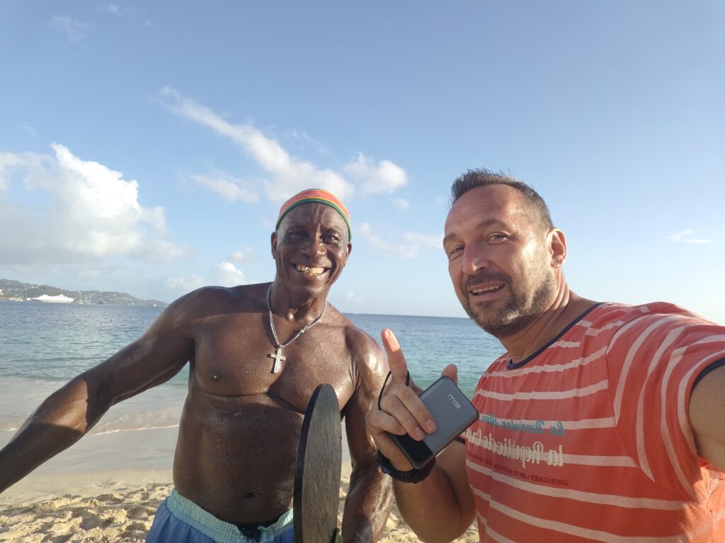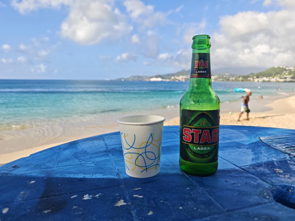 Na poslední noc jsem se přesunul blízko letiště, neboť jsem nechtěl riskovat jízdu za tmy nebo ranní zácpy. Ubytoval jsem se relativně blízko vyhlášené pláže Grand Anse Beach a z apartmánů pana Finche jsem si udělal udržovací procházku na pláž. Chtěl jsem si dát místní specialitu „roti“, ale dva pokusy nevyšly neb buď měli v sobotu zavřeno a nebo měli jen kuře s rýží. Na pláži jsem sledoval místní hráče pingpongu, poradil jim co dělají špatně, dal si jeden místní rum a před setměním jsem se pokusil ulovit něco k jídlu. Nakonec jsem po cestě do apartmánu našel kubánskou pouliční restauraci Little Havana a tak jsem tam zamířil. Vývěsní štít jsem našel, ale obsluha přiznala, že restauraci převzali a nabízejí jamajská jídla. Majitelka pocházela z Austrálie, ostatní personál z jamajky a to vše na ostrově Grenada. Dal jsem si nakládané vepřové maso a jamajskou specialitu s názvem festivals.